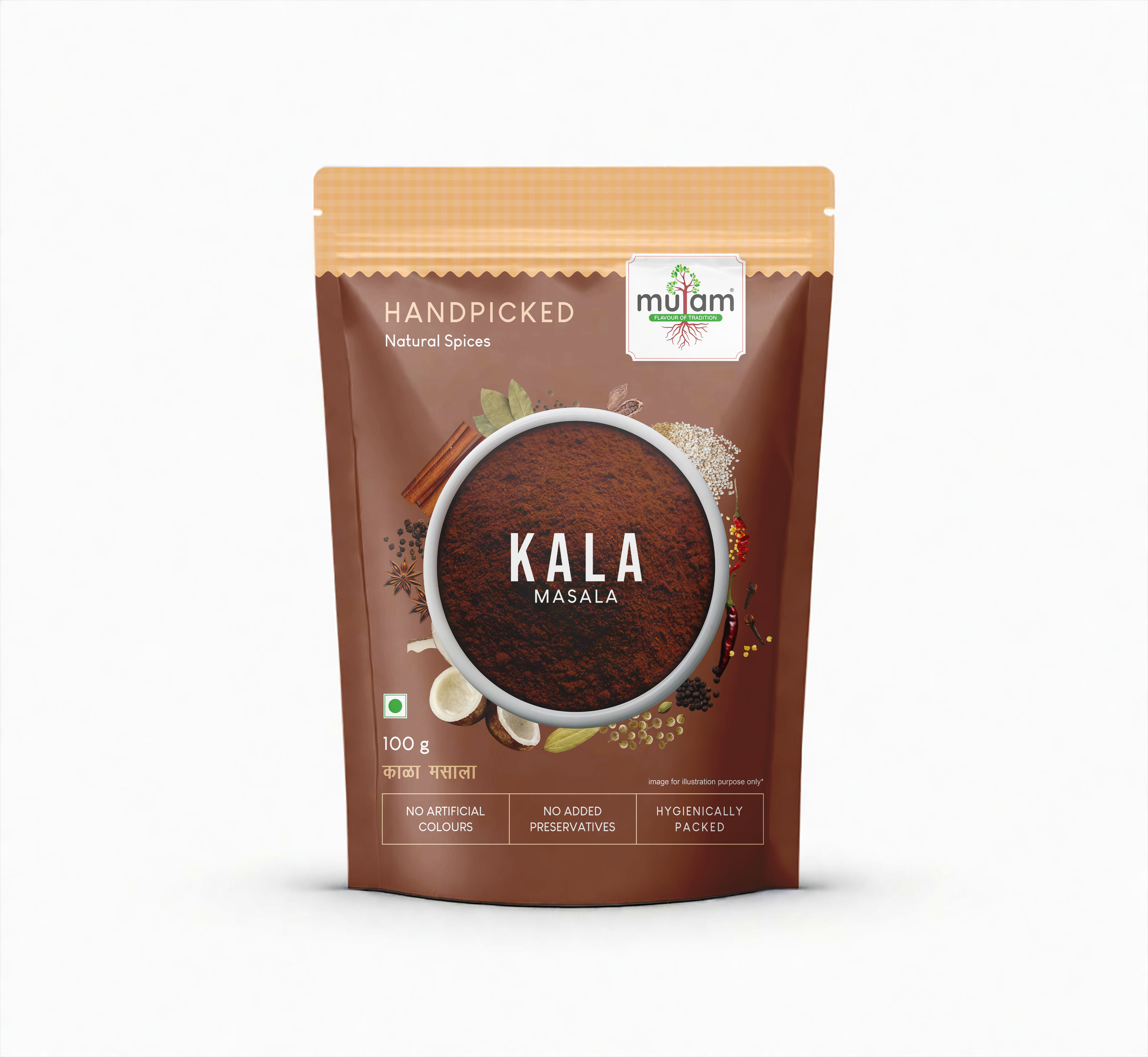 Kala Masala, also known as "Black Masala," is a traditional spice blend from Maharashtra, India, distinguished by its deep, rich flavors and aromatic profile. It typically contains a variety of roasted and ground spices, including: